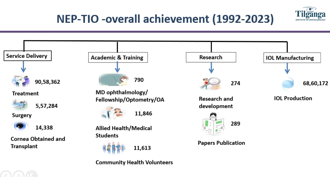 Nepal Eye Program was officially launched in July 1992 to support the prevention & control of blindness in Nepal and the region. Tilganga Institute of Ophthalmology (TIO), previously called as Tilganga Eye Centre, is the implementing body of the Nepal Eye Program, a not-for-profit, community-based organization. With an aim to act as a model for treatment, research, and training, one of the active members of Apex Body for Eye Health, Ministry of Health (MoH), High Level Committee for Eye Health, Ministry of Health, Nepal. The TIO facility was opened in 1994. Tilganga Eye Hospital (TEH) has been a World Health Organization (WHO) Collaborating Centre for Ophthalmology since June 2019.