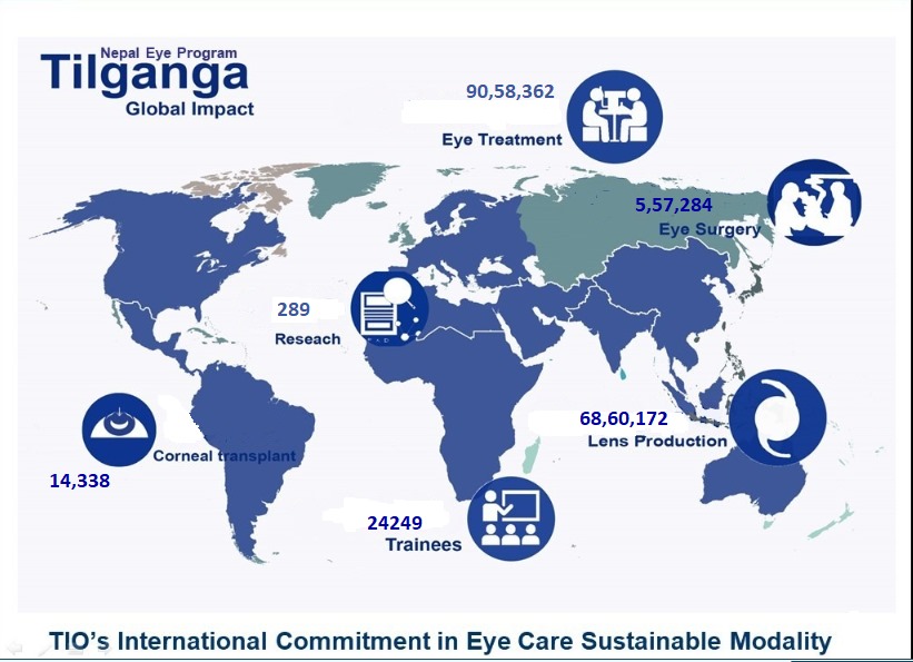 TIO now incorporates six divisions that are: The Tilganga Eye Hospital with a fully modern ophthalmic facility, the Academic and Training department that runs fellowship, academic programs, short and long-term training, and exposure training, the Outreach department covering cataract screening and surgical camps throughout Nepal and some other countries abroad, Research department focusing on improving clinical as well as operational activities, Nepal Eye bank which operates an eye donation program to provide corneas to tackle corneal blindness and Manufacturing facility which produces world-class intraocular lens at an affordable cost.